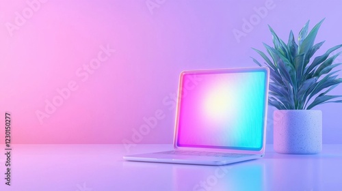 laptop, computer, technology, digital, plant, potted plants, desk, workspace, background, pink, blue, purple, light, glow, vibrant, modern, minimal, clean, white, surface, digital artwork, neon, colourful, bright, aesthetic, desktop, screen, display, electronic, contraption, device, office, home office, work, still life, design, graphic design, illustration