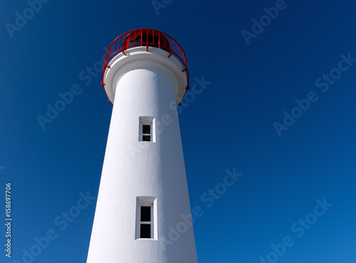island, tower, coast, nautical, white, lighthouse, red, landmark, light, building, beacon, window, safety, blue, maritime, marin, sky, house, sea, water, coastline, navigation, landscape, ocean, harbor, blue skies
