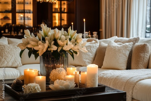 lily, candle, white, flower, living, room, cosy, decor, home, interior, design, elegant, sophisticated, comfort, warmth, relaxation, peaceful, serene, tranquil, calm, ambience, atmosphere, romantic, soft, plush, pillow, cushion, throw, blanket, vase, glasses, hydrangea, table, hot drink, tray, wooden, dark, light, glow, flames, scent, aroma, fragrance