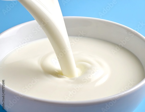 White liquid pouring from above into a white bowl, against a blue backdrop