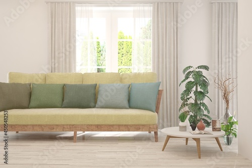 White living room with sofa and summer landscape in window. Scandinavian interior design. 3D illustration