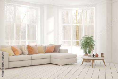 White living room with sofa and winter landscape in window. Scandinavian interior design. 3D illustration