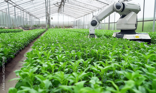 White machine with robotic arm working in greenhouse over plants. Autonomous agriculture and farming concept. Generative AI