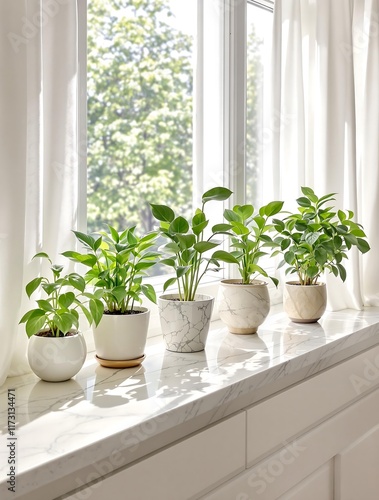 White Marble Surface with Potted Plants, Creating a Serene Backdrop for Personalized Text or Images
