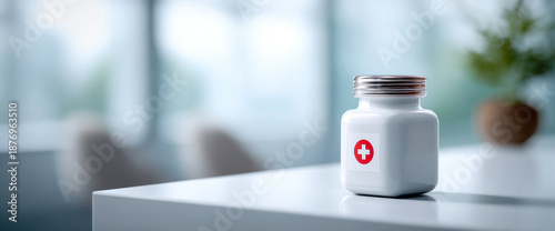 White medical container with red cross symbol on white surface in bright modern room with blurred background