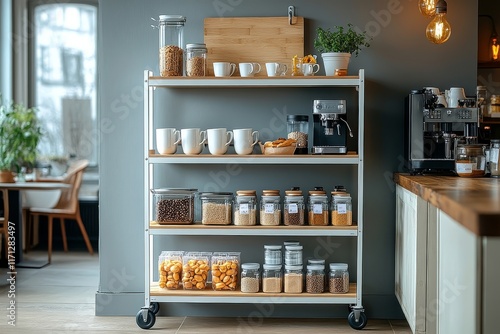 White metal and wood kitchen storage shelf with wheels, holding coffee mugs, cake boxes, and food items, with espresso machine and dining table in modern home interior.