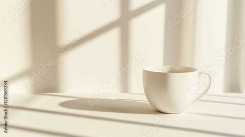 mug, cup, hot drink, tea, drink, ceramic, white, sunlight, shadow, window, light, morning, home, cosy, warm, calm, peaceful, relaxing, minimalist, simple, clean, bright, background, texture, surface, table, still, life, object, design, interior, space, aesthetic, style, porcelain, beverage, hot, comfort, elegance, purity
