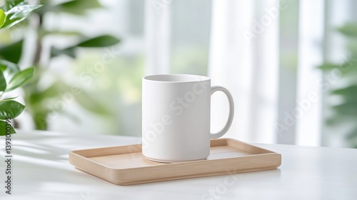 mug, hot drink, tea, drink, white, wooden, tray, home, interior, kitchen, living, room, table, cup, ceramic, simple, minimalist, design, decor, modern, clean, light, natural, plant, green, sunshine, daylight, morning, afternoon, still, life, empty, blank, product, display, photo, image, background, sharpened, lighting, stylish, elegant, aesthetic, porcelain, comfort, relaxation, quiet, calm