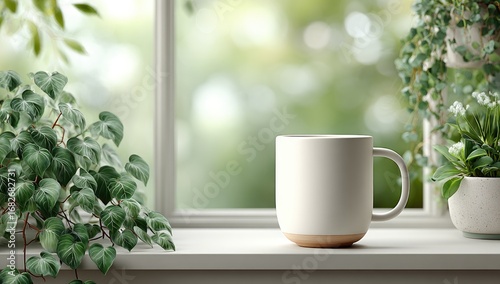mug, white, window, plant, greenery, nature, calm, hot drink, tea, sill, daylight, light, soft, sharpened, simple, minimalist, home, cosy, interior, design, decor, garden, patio, fresh, organic, natural, clean, modern, ceramic, potted, ivy, leafy, lush, bright, spring, summer, peaceful, relaxing, aesthetic, empty, blank, texture, still, life, view, natural light, outdoors