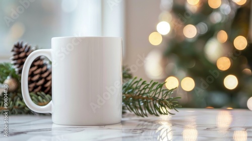 mug, white, pine, tree branch, cone, christmas, tree, light, blur, background, marble, surface, holiday, decor, winter, festive, cosy, warm, bright, sparkle, green, brown, gold, ceramic, cup, drink, hot drink, tea, hot, beverage, celebration, season, joy, gift, present, simple, elegant