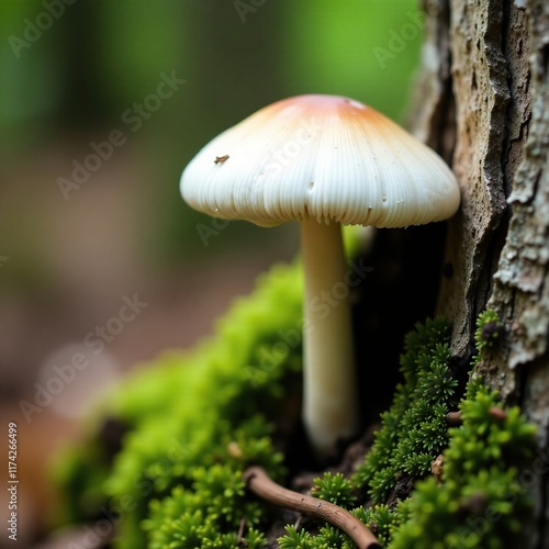 White mushroom growing on birch tree trunk with moss, natural, roots, soil