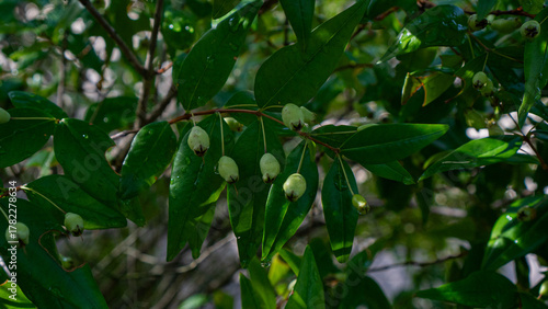 White myrtle branch with green berries and shiny leaves in natural sunlight