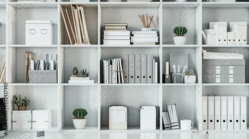 shelf, office, desk, white, book, folder, storage, organisation, workspace, design, modern, minimal, simple, clean, tidy, organised, functional, interior, home, work, professional, business, room, furniture, decor, style, supply, stationary, paper, pen, plant, cactus, box, grey, grey, light, empty, open, arrangement, bright, minimalist, practical