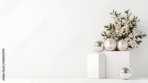 White ornaments and greenery rest on white geometric platforms. A sprig of white flowers and green leaves adds texture. The image is clean and minimalist, with soft, even lighting. It has a calming,