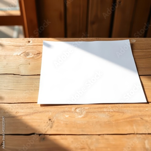 White paper sheet on rustic wooden table, natural light, note, visual, weathered