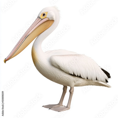 White Pelican Profile Detailed Feathers and Long Beak on White Background