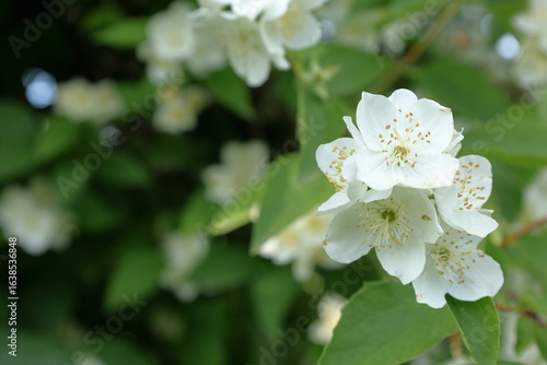 White philadelphus coronarius flowers with green leaves. Also called English dogwood.