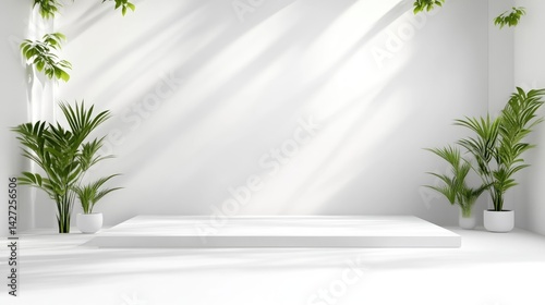 platform, plant, minimal, white, background, sunlight, shadow, greenery, studio, clean, display, showcase, modern, interior, design, botany, foliage, bright, serene, peaceful, calm, tropical, elegant, simple, airy, roomy, room, neutral, texture, light, illumination, presentation, product, aesthetic, lifestyle, scene, setting, ambience, freshness, purity, calmness, home, decor, style, exhibit, blank, empty