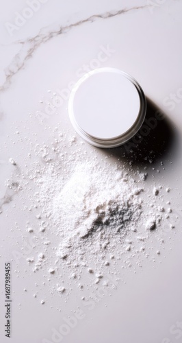 powder, white, lid, marble, surface, cosmetic, beauty, product, top, view, flat, lay, texture, scattered, pile, circle, round, container, cardboard box, powdered, make-up, clean, elegant, minimalist, simple, modern, studio, light, shadow, still, life, photo, image, organic, natural, high, quality