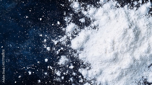 White powder spills on a dark surface, creating a textured contrast between the scattered granules and the solid piled powder.