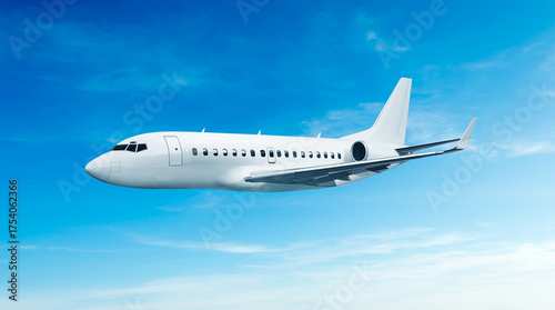 White private jet airplane side view flying in the blue sky background. Modern private jet airplane.