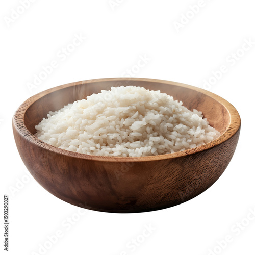 White rice in a wooden bowl, isolated on a transparent background. PNG file