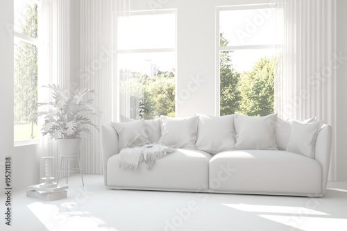 White room with sofa and green landscape in window. Scandinavian interior design. 3D illustration