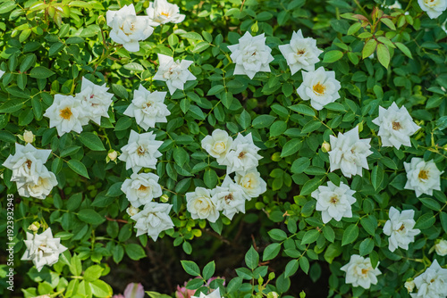 White roses bloom among green leaves, adding beauty and calm to the garden