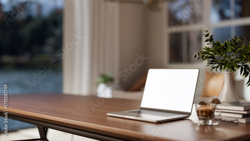 three-dimensional, rendering, illustration, indoor, no people, house, home, apartment, residence, studio, office, home office, room, building, modern, contemporary, living room, table, desk, tabletop, counter, window, wood, background, blank screen, laptop, cyberspace, working, study, hot drink, glasses, cup, book, vase, acorn, computer, curtain, wall, cosy, door, garden, morning, evening, dawn, dusk, advertising