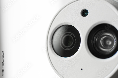 White security cctv dome type camera close-up. Lens and ir