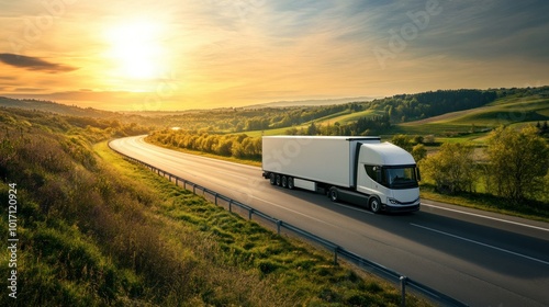 White Semi-Truck Driving on a Winding Road Through a Scenic Landscape at Sunset