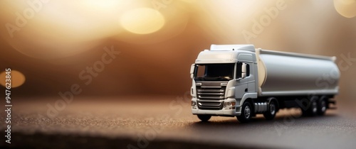 white, semi, truck, model, tanker, trailer, surface, brown, grey, vehicle, transportation, transport, logistic, delivery, cargo, good, road, highway, asphalt, tire, wheel, cab, engine, chassis, metal, plastic, miniature, toy, sharpened, blur, bokeh, background, light, shadow, daytime, bright, shiny, clean, new, modern