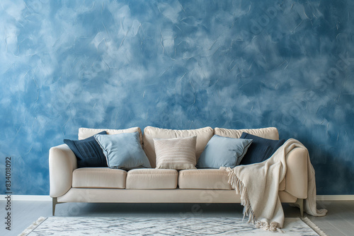 white sofa in a room, A modern cozy living room featuring a striking blue wall texture that sets the tone for a stylish and inviting interior design