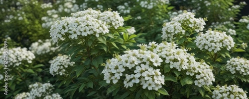 White spirea bush with fresh flowers in full bloom, nature, floral, blooming