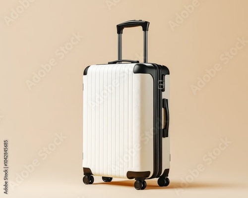 White suitcase with black accents and wheels on a beige background.