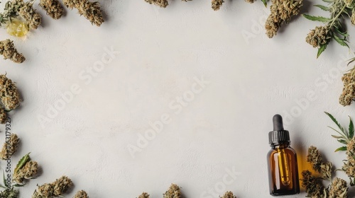 White surface with dried cannabis buds arranged in a circle around a bottle of CBD oil, clean and natural presentation.