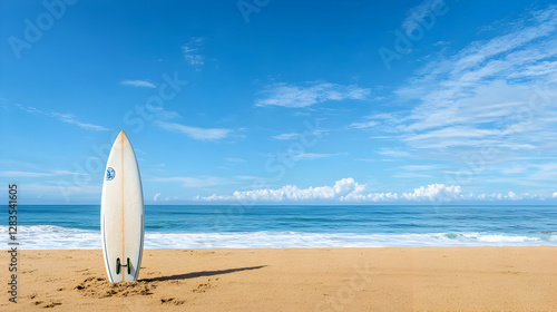 White Surfboard Standing Upright on Sandy Beach Beside Blue Ocean Under Sunny Sky
