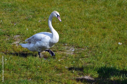 White swan, bird of the family Anatidae within the genus Cygnus. Beautiful white swan waking on the grass. Place for text