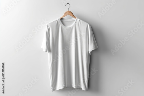 t-shirt, minimalist, clean, simple, light, bright, fresh, subtile, daylight, indoor, studio, apparel, clothing, fashion, design, presentation, merchandise, display, textile, cotton, fabric, hanger, shirt, sleeve, neck, garment, wood, wall, background, surface, tone, shadow, white, plain, casual attire, template, product, market, retail, selling, advertising, promotion, branding, style