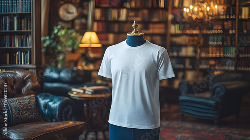 t-shirt, white, mannequin, library, book, bookshelf, clothing, apparel, fashion, style, room, interior, design, classic, elegant, simple, clean, minimal, cotton, textile, garment, casual attire, comfortable, soft, smooth, texture, model, display, product, background, space, vintage, old, dark, light