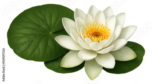 White water lily with large, floating round leaves and fragrant white flowers with yellow centers