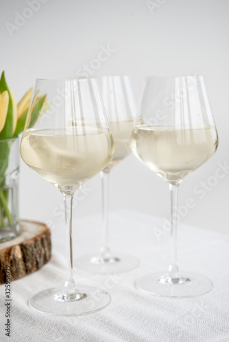 White wine. Dry wine. Glass of wine on the backgound table. Spring flowers. Yellow tulips.
