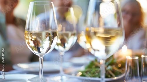 wine, goggles, drink, table, gathering, celebration, eatery, dining, white wine, alcohol, clear, gold, liquid, people, blur, background, light, sunlight, daylight, day, summer, image, food, beverage, party, tableware, holiday, meal, dinner, lunch, celebratory, copy space, isolated, closeup, soft focus, sharpened, outdoors, glasses, drink, champaign