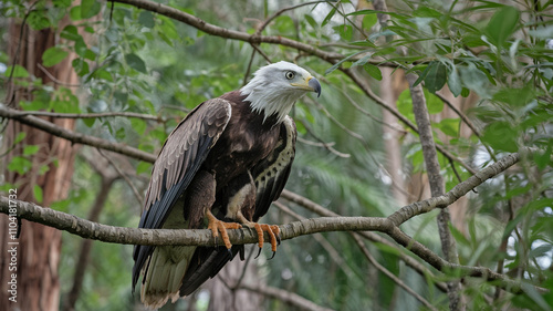 eagle, sea eagle, bird, bird of prey, perched, tree branch, foliage, green, tree, forest, nature, wildlife, avian, feathered, predator, bird of prey, talon, beak, head, wing, tail, eye, yellow, brown, black, white, grey, natural, habitat, tropical, jungle, outdoors, zoology, ornithology, fauna, animal, wild, photo, photo, image, picture, visual, art, environment, conservation