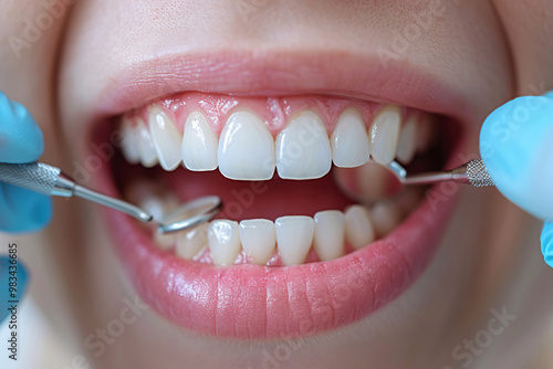 Whitening dental clinic, smiling girl, whitening procedure, satisfied woman sitting, professional doctor fixing teeth, dental consultation, dentist showing, healthy teeth, teeth cleaning.