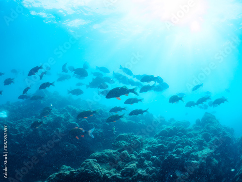 美しいホウライヒメジ(ヒメジ科)、ニザダイ(ニザダイ科)、メジナ(イスズミ科)他の群れ。 英名学名:Whitesaddle goatfish, Parupeneus ciliatus Sawtail juvenile (Prionurus scalprum) Largescale Blackfish, Girella punctata 静岡県伊豆半島賀茂郡南伊豆町中木ヒリゾ浜2024年