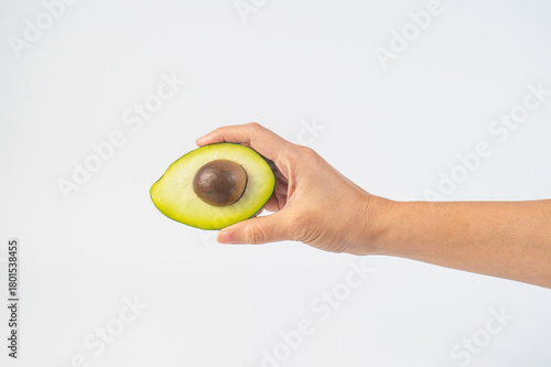 whole and half avocado and hand isolated on white background close-up.