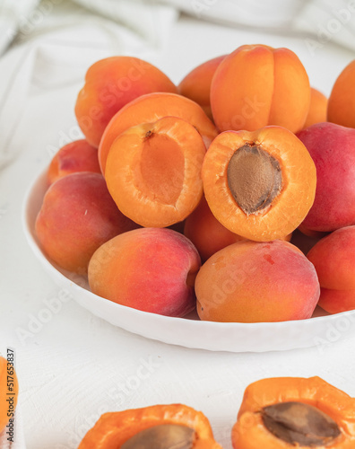 Whole and peeled orange apricots in a white plate on a kitchen table. Raw organic food.