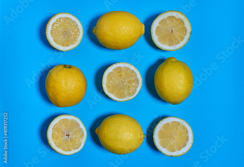 Whole and split lemons on a blue background. CITRUS CITRIC
