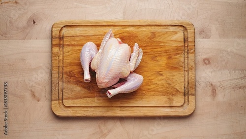 Whole raw chicken resting on a wooden cutting board in a kitchen setting ready for preparation